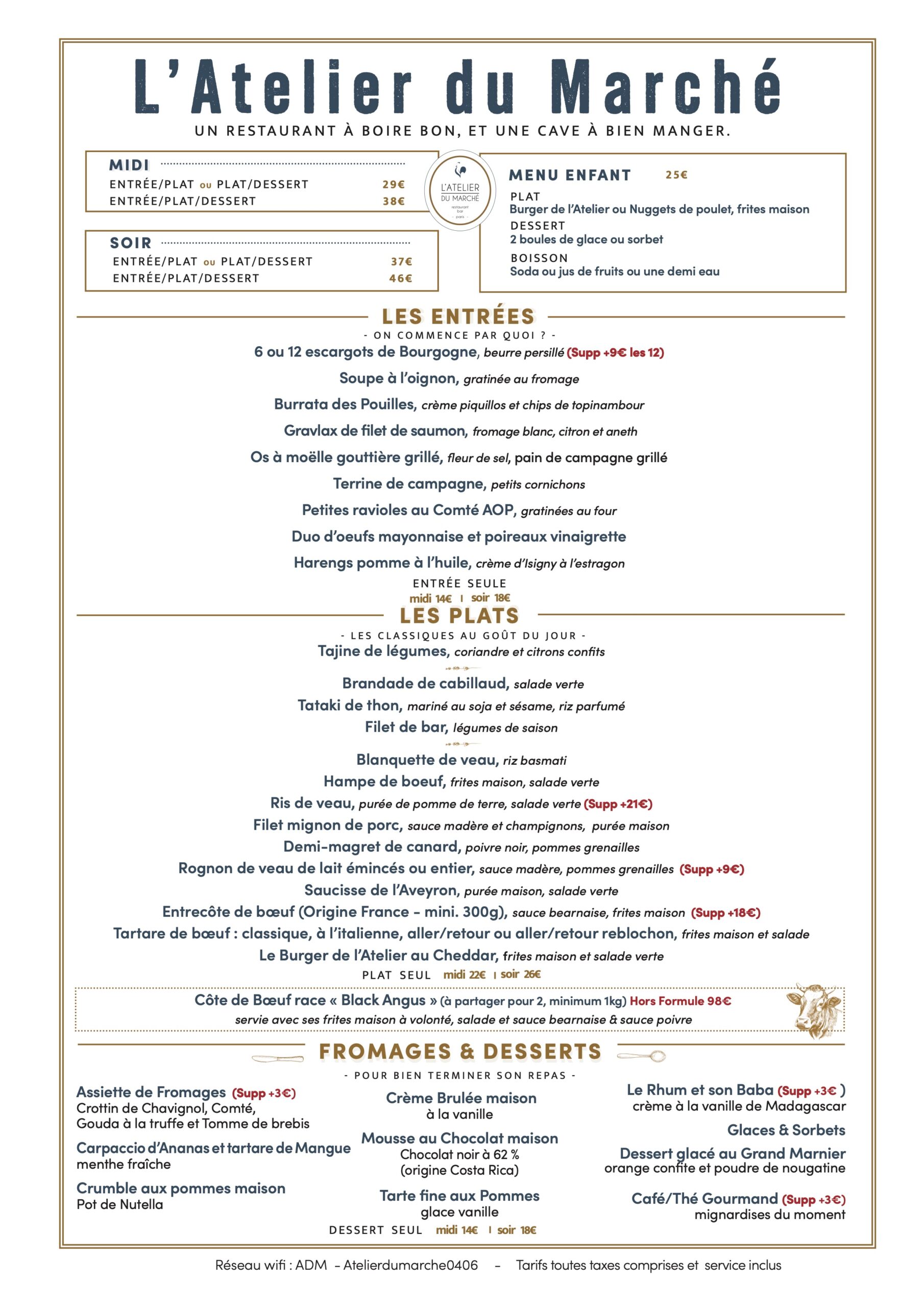Nous n’utilisons que des produits frais et nos recettes sont faites « Maison » (frites, sauces, gravlax de saumon, tajine de légumes, béarnaise, crème brulée, mousse au chocolat, etc, etc) Nos plats sont accompagnés de nos meilleurs flacons disponibles au verre, en pot de 50cl, en bouteille et certaines en magnum !